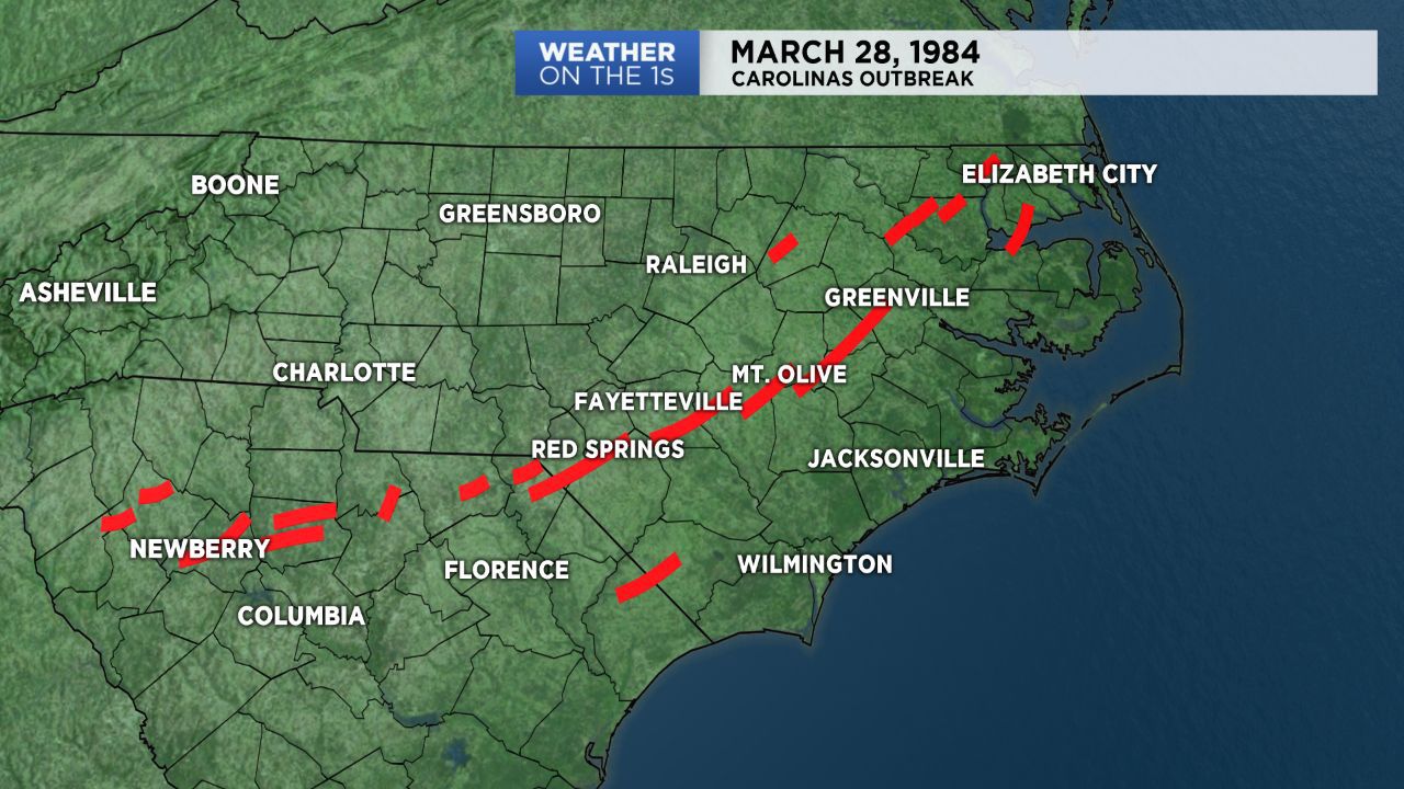 The Carolinas Outbreak of March 28 1984 spanned South and North Carolina. The paths are not intended to show the full extent of the damage area. Twenty-two tornadoes were reported across both states that day.