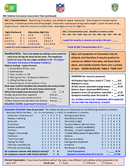 NFL Sideline Concussion Assessment Tool continued SAC Concentration. The baseline concussion test is used by the NFL to enforce a strict policy of concussion handling. Missachten NFL-Teams das Concussion Protocol drohen harte Strafen.