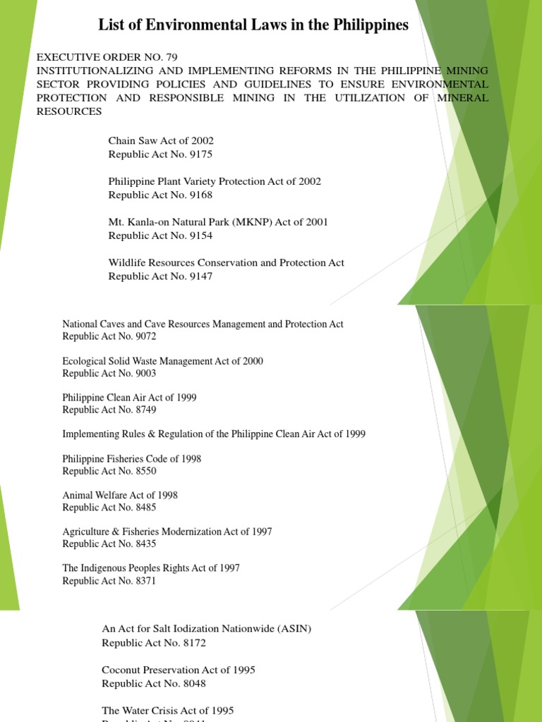 Some of the important legislations for environment protection are as follows. Philippine Environment Code Presidential Decree No. Summaries of environmental laws and EOs.